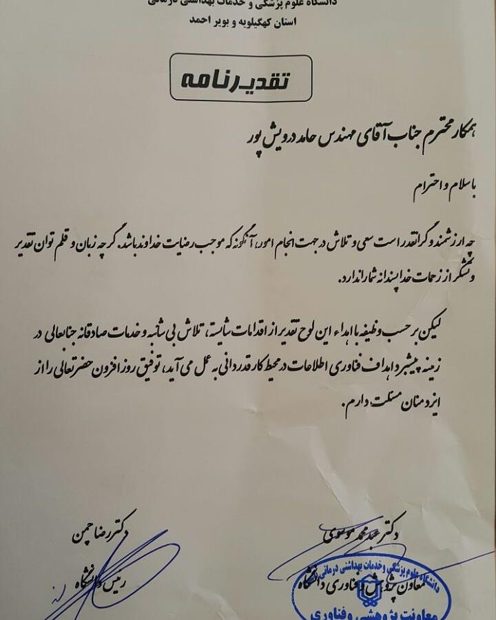 تقدیرنامه رئیس دانشگاه علوم پزشکی یاسوج